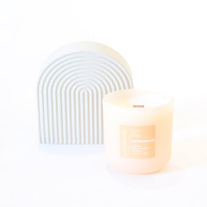 RETROGRADE Hand Poured Candle. Wood Wick. Elemi Resin. Lit Matches. Unrefined Beeswax. Big Leaf Mahogany. 14 oz. Blush Peach Matte. Large.
