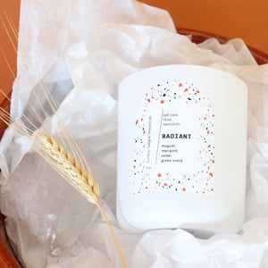 RADIANT Hand Poured Candle. Muguet. Cassis. Cedar. Marigold. Green Wood. Wood Wick. 12 oz. Matte White.