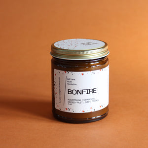 BONFIRE Hand Poured Candle. Cedarwood. Charcoal. Dried Fruit. Tonka. Leather. Amber Jar. 7 oz. Cotton Wick.